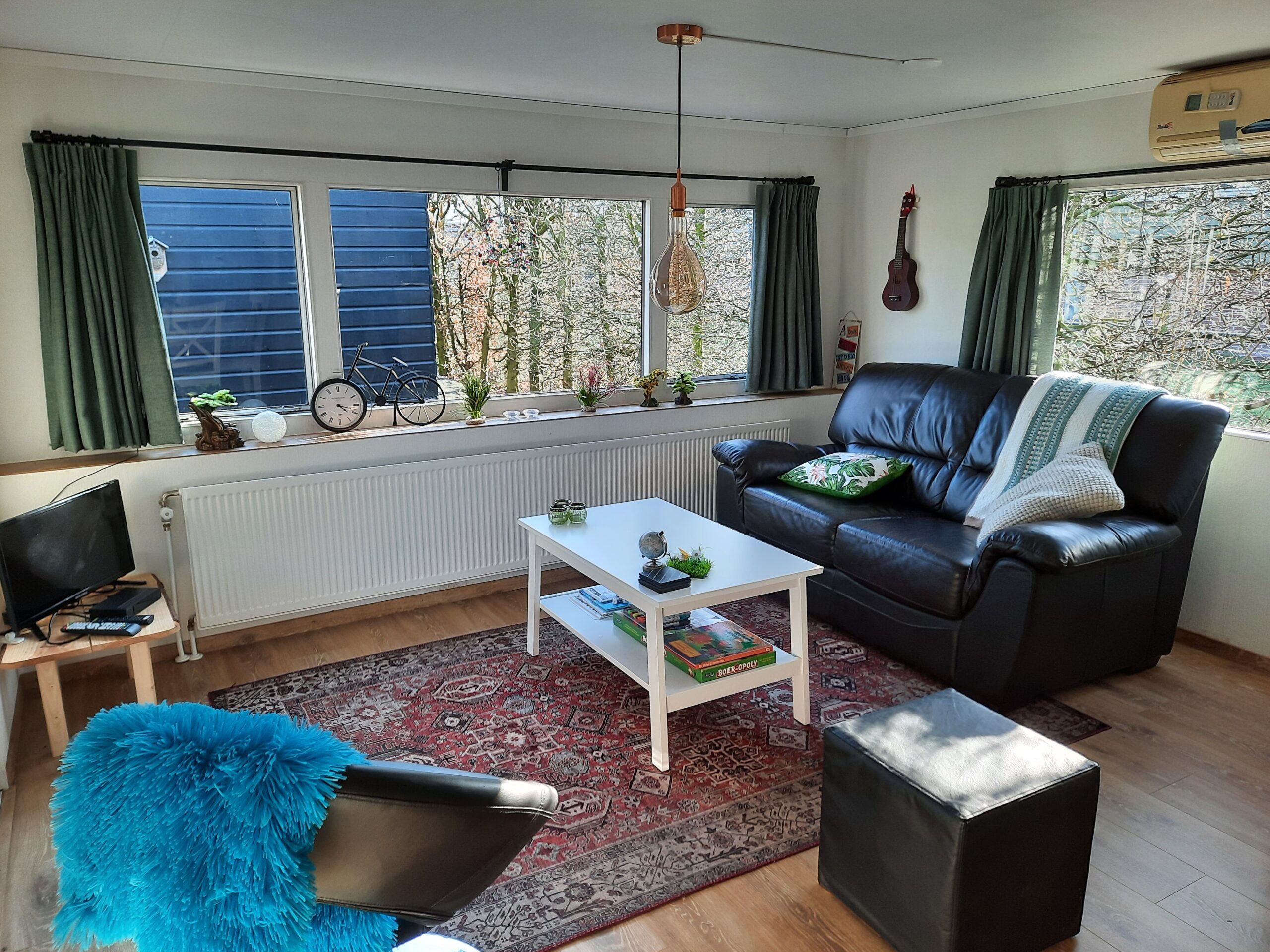 Het is compleet ingericht en van alle gemakken voorzien. Heeft een eigen veranda met een houtkacheltje aan de voorkant. Aan de zijkant en achter staan ook nog bankjes.