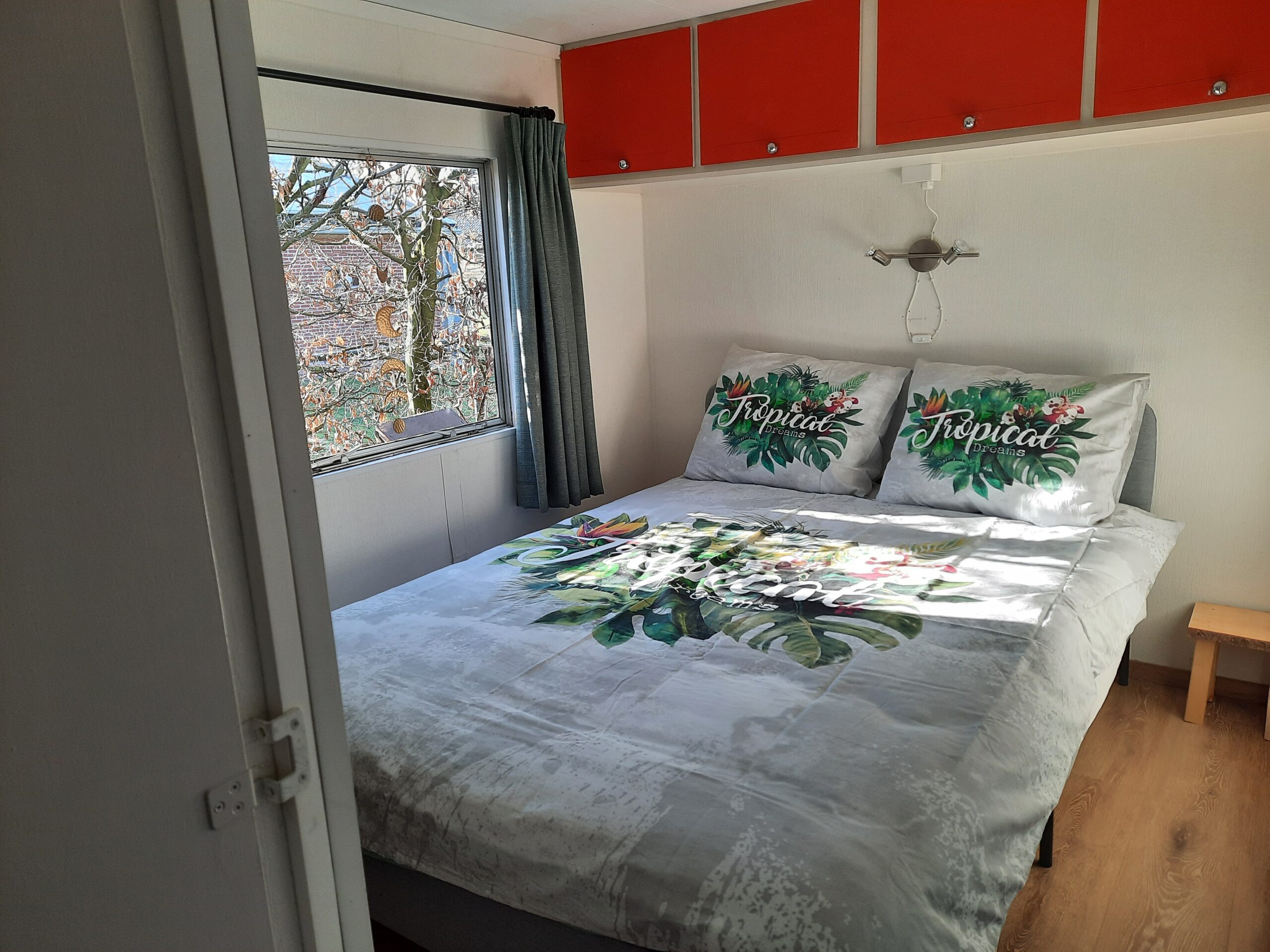 Bedden zijn opgemaakt bij aankomst. Huisje staat onder een grote boom op een schaduwrijke plek.